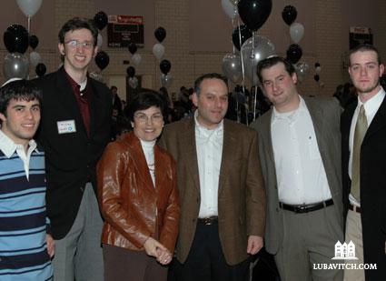 Chair of the UJF, Professor Barbara Burstin, and President/CEO of UJF, Jeffrey Finkelstein flanked by CMU ZBT brothers, at left: Joshua Tepper, Evan Gross, at right, Josh Mann, Ari Klein