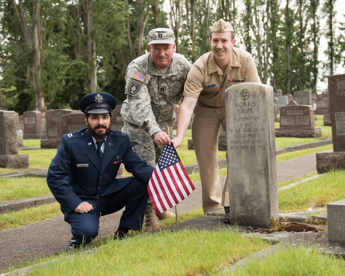 Shliach and AF Chaplain (Capt.) Elie Estrin with Capt. Ari Wood (US Army) and Lt Commander Greg Touchton (US Navy) place flags and pray at the graves of US military veterans in Seattle, in a program sponsored by the local chapter of Jewish War Veterans and co sponsored by various Jewish communal groups. Photo credit Meryl Alcabes, Meryl Alcabes Photography.
