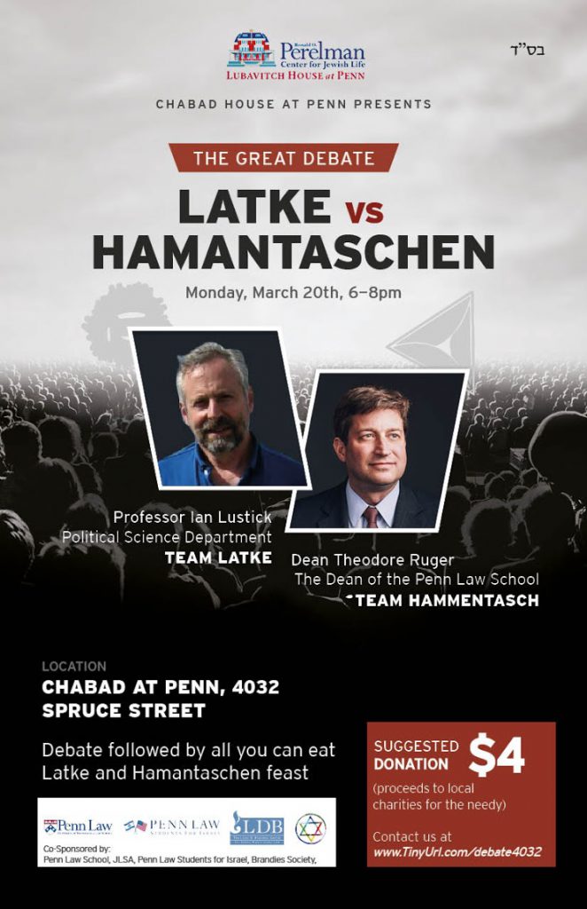 University of Pennsylvania will witness its first-ever Latke–Hamantash Debate debate at the Chabad House at Penn.