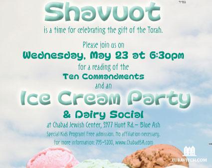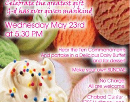Kids are the magnets for programming planned at Chabad Jewish Center of Cincinnati, OH. Program directors Rabbi Berel and Zipora Cohen are merging the ritual of hearing the Ten Commandments with the custom to eat dairy foods. With Ziploc baggies, rock salt, milk, sugar and vanilla, the kids will make their own ice cream. Meanwhile teens will rehearse scenes from the Book of Ruth, which is read on Shavuot, and adults will socialize over cheesecake.