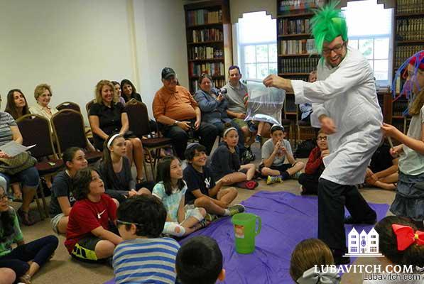 Rabbi Michoel Goldin, youth director of Chabad of Teaneck, New Jersey has been working with kids since he was a teenager. Dressed in a doctor’s coat and a green wig, Goldin says his passion for entertaining children has pushed his creativity “out of the box.”