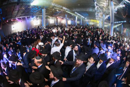 Participants at the banquet dinner of the annual International Conference of Chabad Shluchim take to the floor at Brooklyn’s South Marine Terminal.