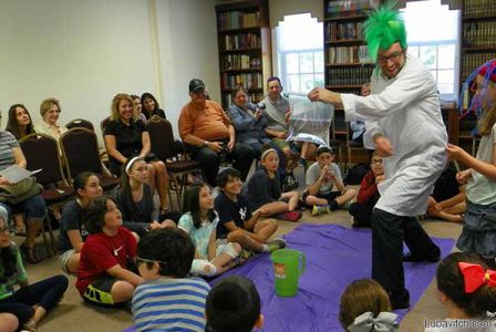 As electric leaf blowers blow rolls of toilet paper, a delighted crowd of young children listen to Dr. Schnitzel derive life lessons from Newton’s laws…