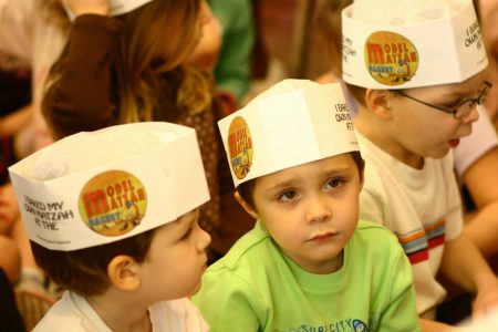 The noise is amped up, the kids are animated. Rabbi Levi Landa is dressed up as Moses. Elaborate backdrops and props depict the story of…