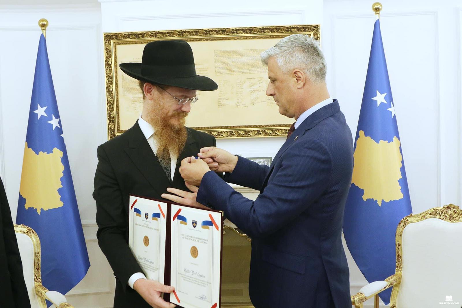Chief Rabbi of Albania and Chabad representative to Thessaloniki and the Lower Balkans Rabbi Yoel Kaplan received a surprise award from Kosovo President Hashim Thaçi last week.