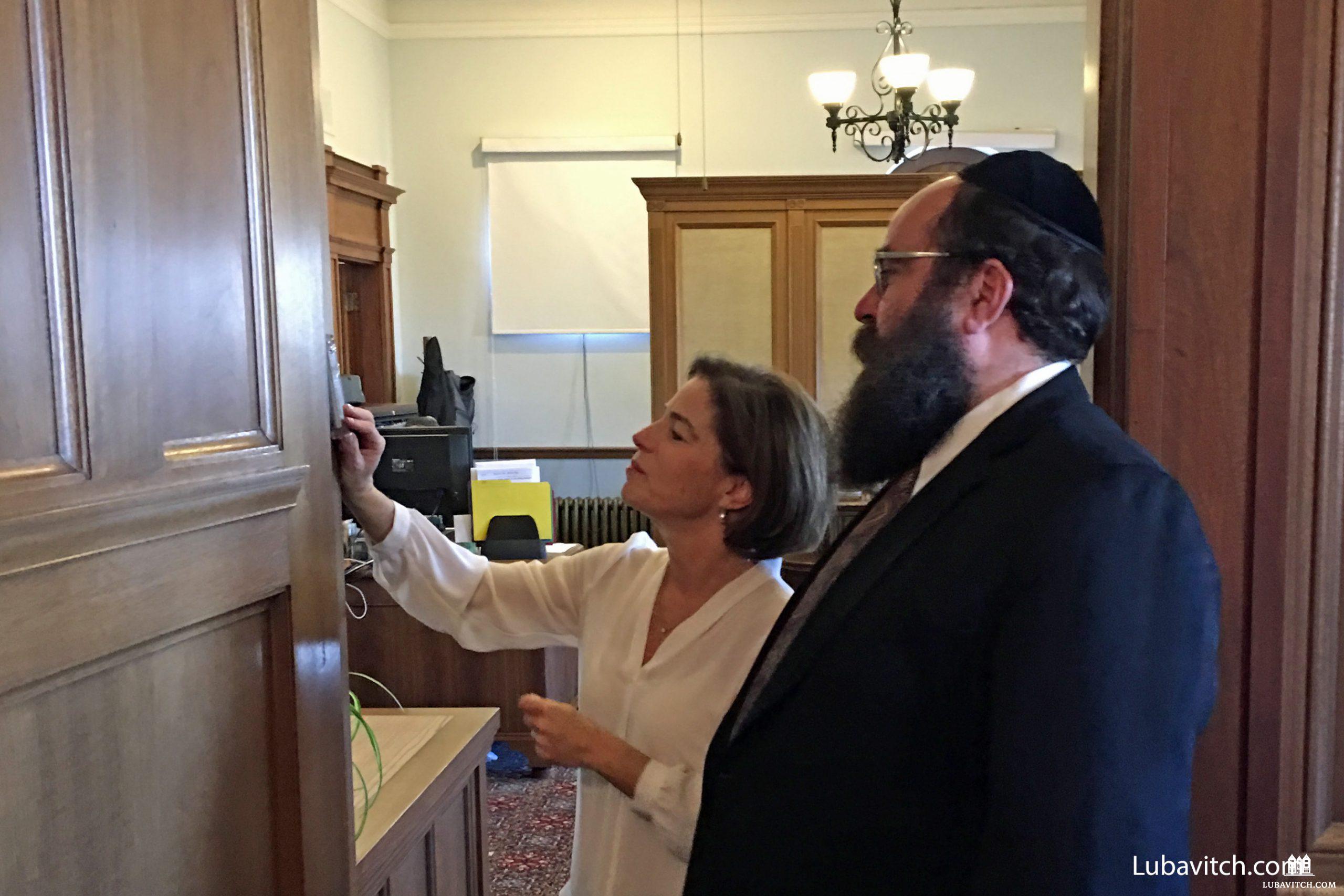 He wouldn’t be the Chabad rabbi if he didn’t remember to offer the Jewish minister a mezuzah for her door.