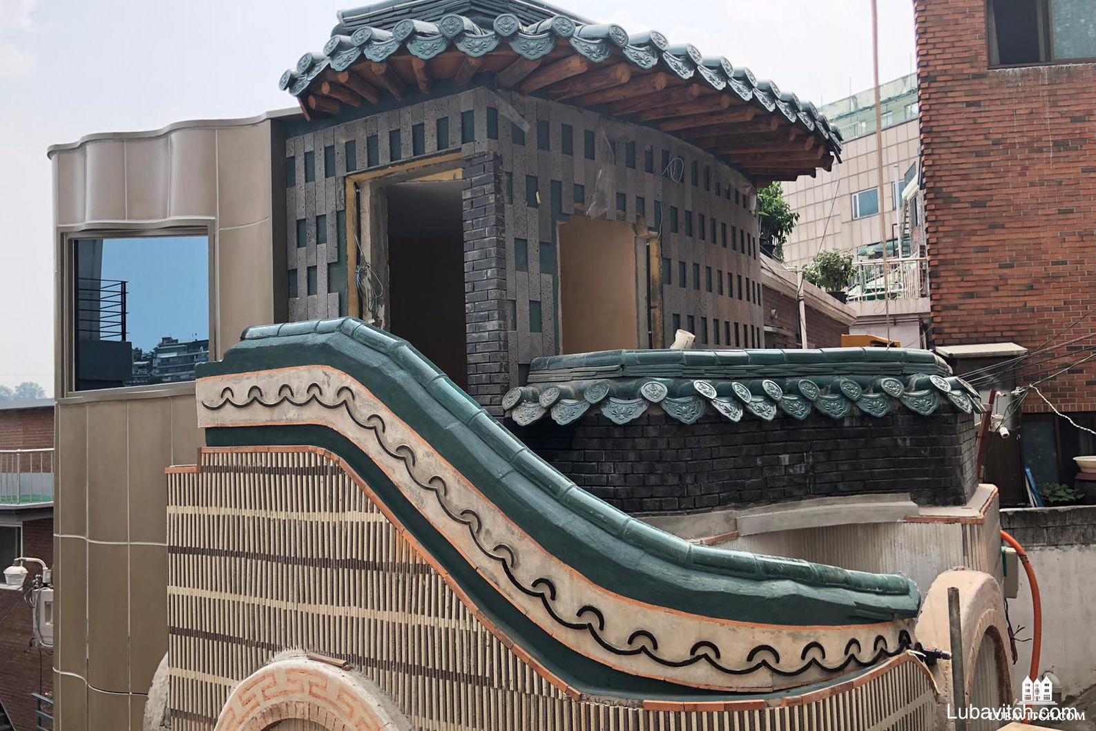 Designed by the emissaries, the mikvah is uniquely Korean. Its roof is reminiscent of the curved, tiled designs that feature prominently in royal Korean architecture, and the waved aluminium panels on the left side of the building are a nod to the modern, high-tech vibe currently sweeping the country. The mikvah pool features intricate mosaic tiles placed along the walls that were artfully formed in the shape of a single droplet of water, encouraging one to contemplate the sanctity and rebirth associated with the waters of the mikvah.