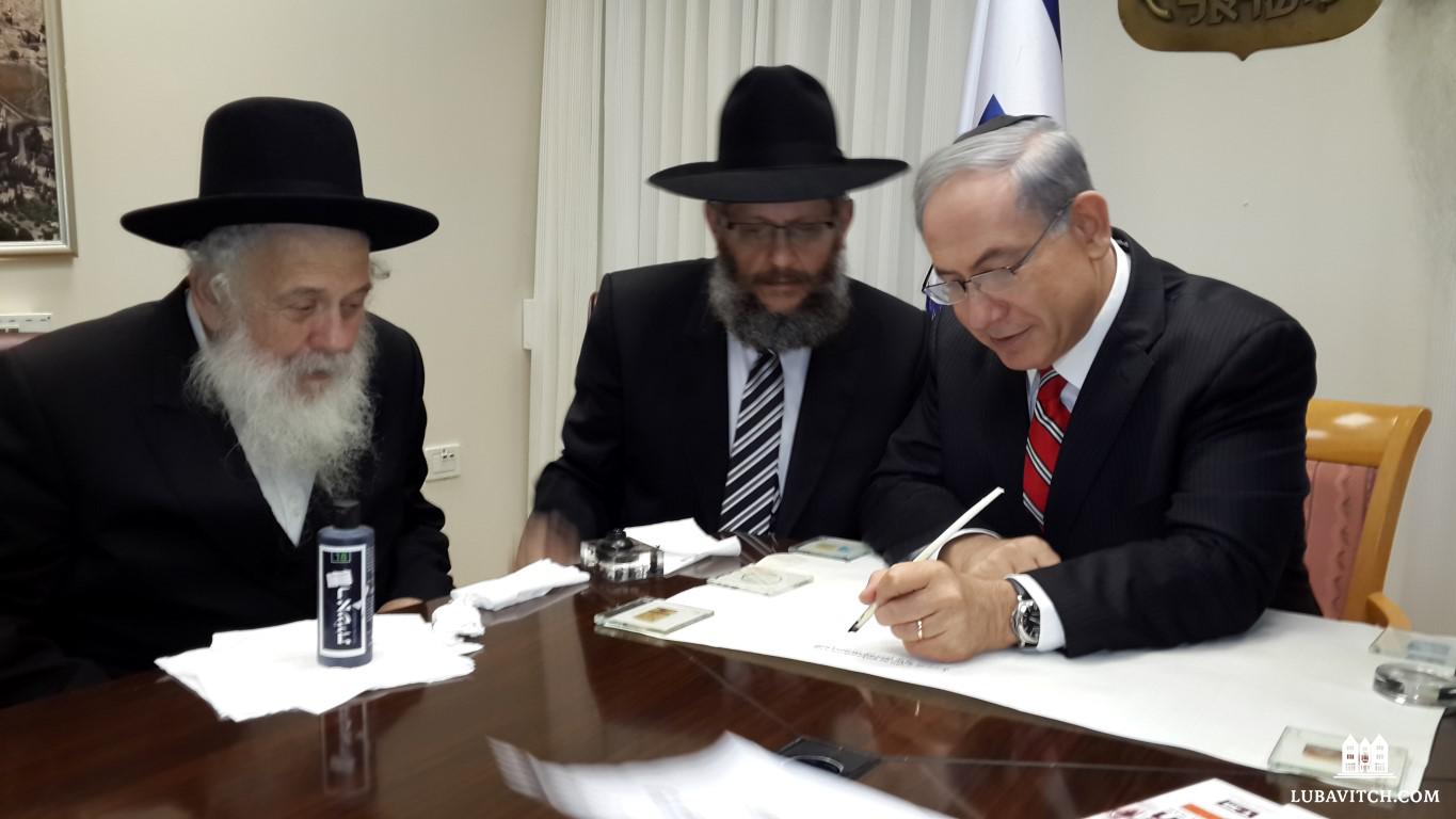 Prime Minister Benjamin Netanyahu hosted a delegation from Chabad and inscribed a letter in a new Torah Scroll that will be dedicated in merit of the soldiers of the IDF.