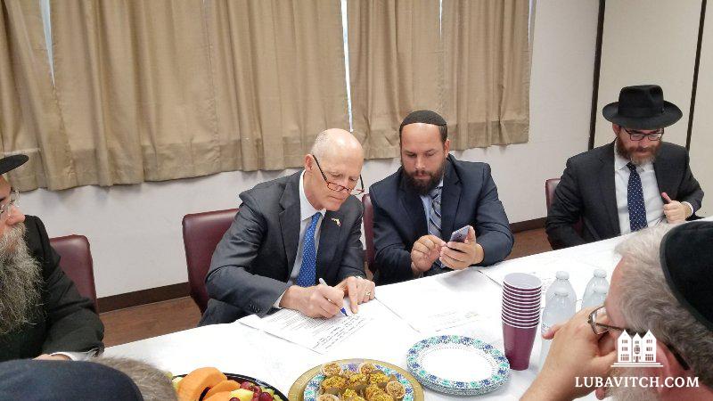 In a private, no-press meeting, Florida governor Rick Scott sat down with Chabad rabbis Monday morning to discuss practical measures in response to the February 14 shooting at the Marjory Stoneman Douglas High School in Parkland, FL.