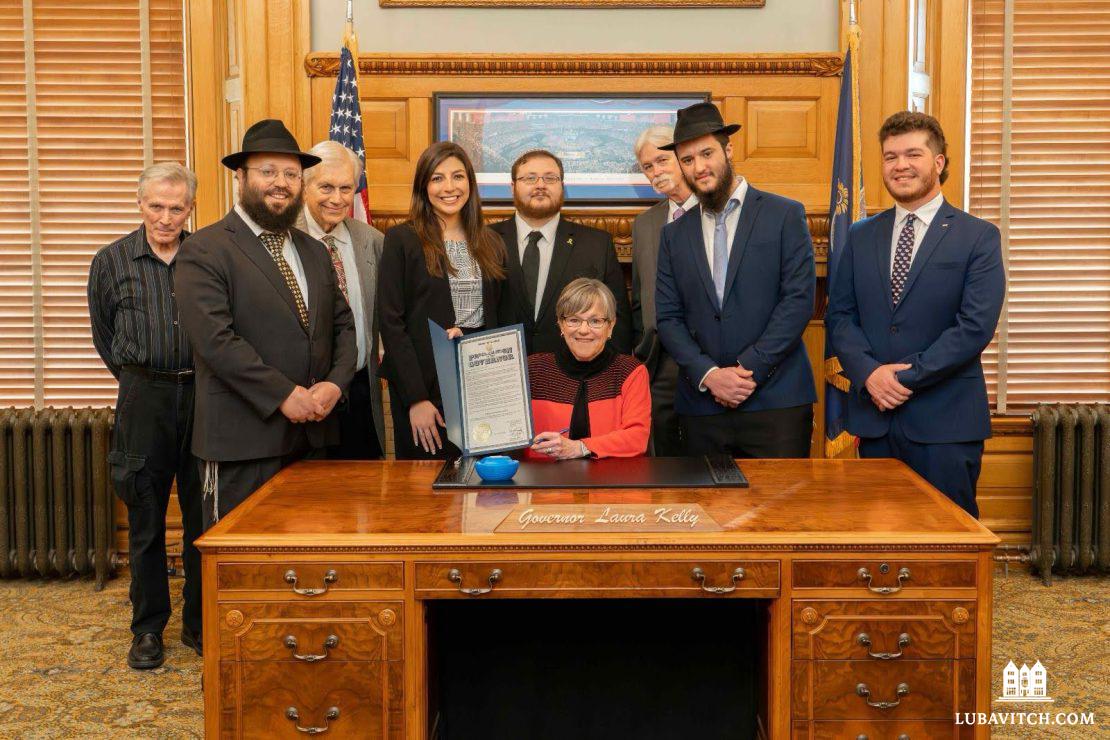 Kansas Governor Laura Kelly presented a proclamation to members of the Kansas Jewish community, including Rabbi Zalman Tiechtel of Chabad at KU and Rabbi Mendel Wenger of Chabad of Olathe — the newest Chabad-Lubavitch outpost in the state.