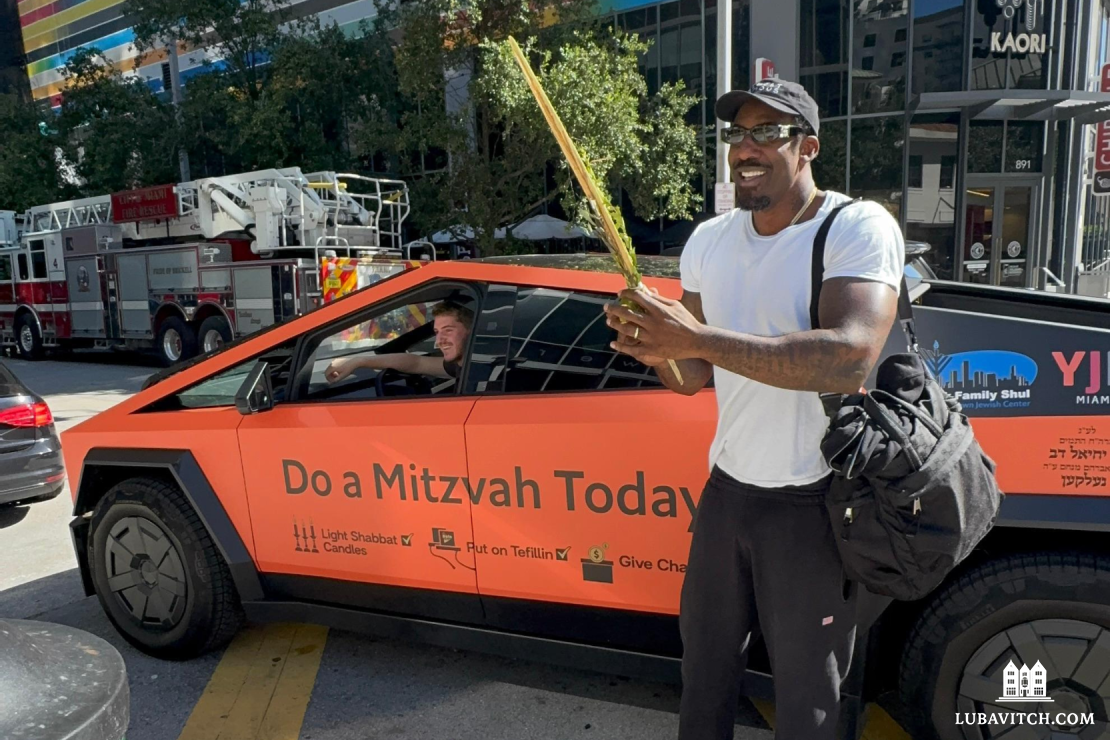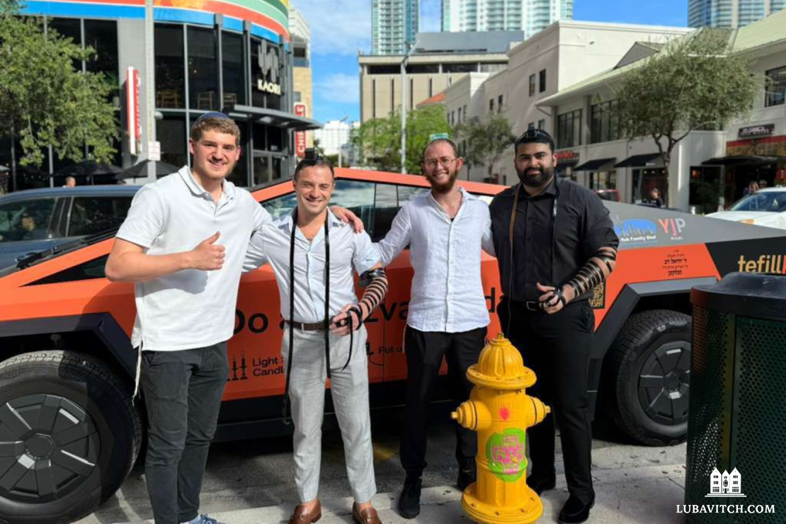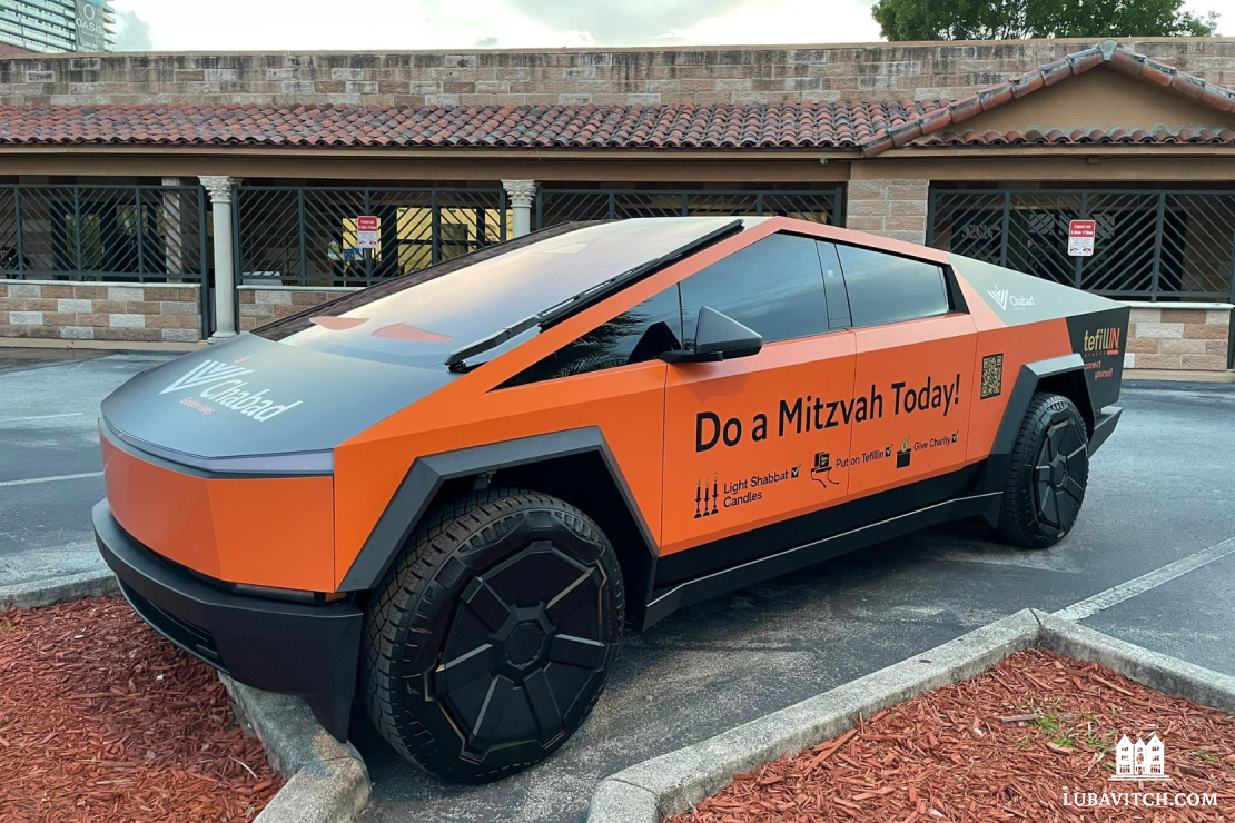 Today, that dream is reality — a sleek, orange Tesla Cybertruck emblazoned with those same words: “Do a Mitzvah Today!” turns heads on downtown Miami’s busiest streets. The aptly nicknamed “Mitzvah Beast” — a nod to the Tesla model beneath the wrap — has become a roving emblem of Jewish pride. The futuristic truck is part Mitzvah Tank, part social statement — inviting passersby to wrap tefillin, light Shabbat candles, and take pride in their heritage right there on the street.