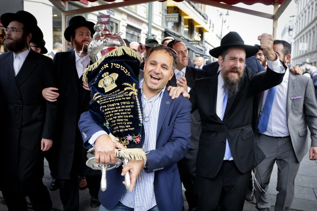 On August 30th, as locals looked on in antcipation, the scribe filled in the last letters of the Torah. Carried under the traditional chuppah canopy, the new Torah was hoisted up as 250 Jews brandishing flags and balloons danced down Oslo’s main street to lively Jewish music.