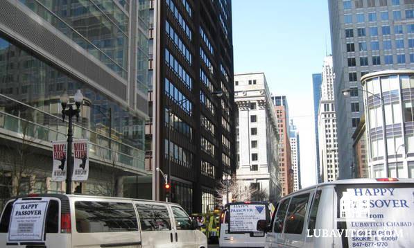 (lubavitch.com) Sporting T-shirts with “This Passover, Experience Your Freedom,” 75 rabbinical students and schoolchildren packed into 13 fifteen-passenger vans last Tuesday on a parade that wove its way through downtown Chicago and its surrounding suburbs.