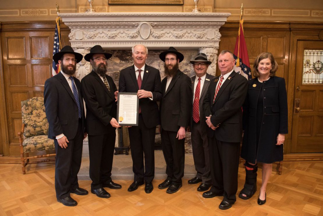 Today in Arkansas: Gov. Asa Hutchinson, together with the Arkansas House and Senate, proclaim March 27, 2018 as “Education And Sharing Day.” Featured in this photo is Chabad of Arkansas’ Rabbi Kramer. This is in recognition of the Lubavitcher Rebbe’s 116th birthday and of his efforts to ensure a healthy education for all.