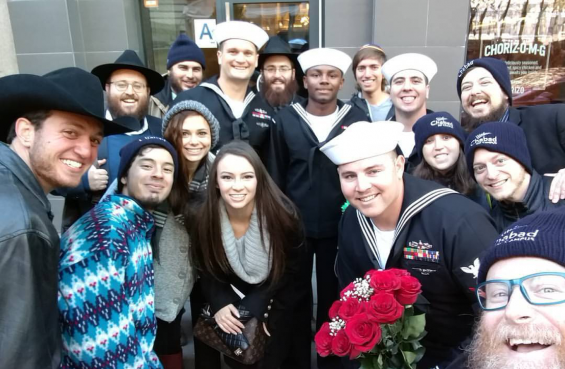 A group of students from Texas A&M University, Texas State University, and Rice University are in New York city for Shabbat to participate in Jewfest, Chabad on Campus’ annual convention. As they toured Manhattan today, they bumped into four sailors who were giving out floral bouquets in honor of Veteran’s day. The group thanked the sailors for their service, and discovered that one of the sailors had a Jewish grandmother. They proceeded to help him put on Tefillin for the first time in his life, and danced together to celebrate.
