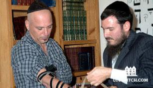 File photo: Howie Mandel wraps Tefillin with Rabbi Chaim Cunin
