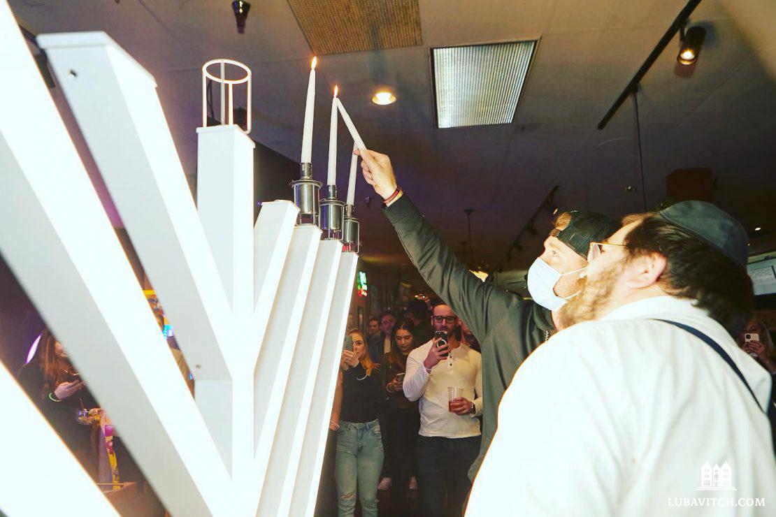 Fresh off kicking a game-winning field goal, Vikings’ kicker Greg Joseph surprised the crowd at a Chabad’s Young Jewish Professionals event Tuesday night when he lit the menorah with Rabbi Sholom & Mushky Brook.