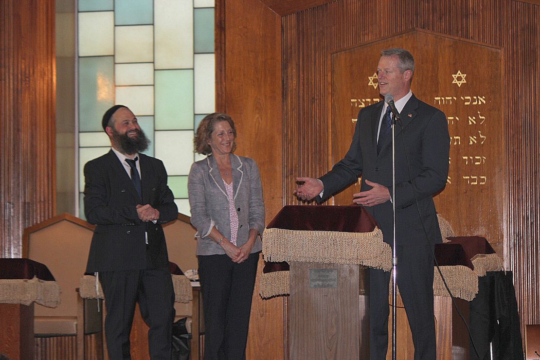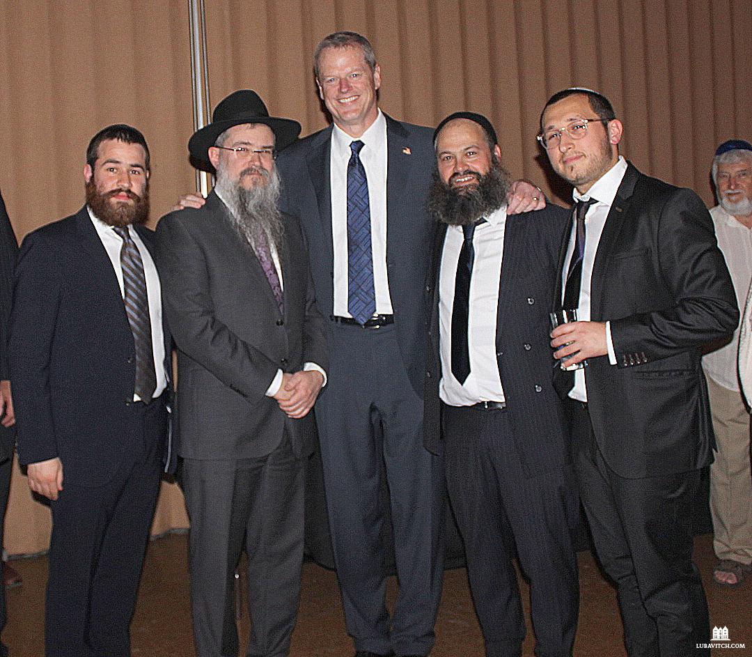 Massachusetts Governor Charlie Baker celebrating Chabad of the North Shore of Boston’s 23rd anniversary with Shluchim Rabbi Yossi Lipsker, Rabbi Shmaya Friedman, Rabbi Moishele Liberow; Rabbi Yosef Friedman brought greetings from Lubavitch World Headquarters.