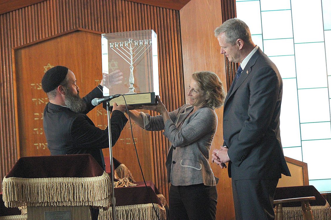 Rabbi Yossi Lipsker presents Governor Charlie Baker and First Lady Lauren Baker with a Menorah and the “Lamplighter Award.”