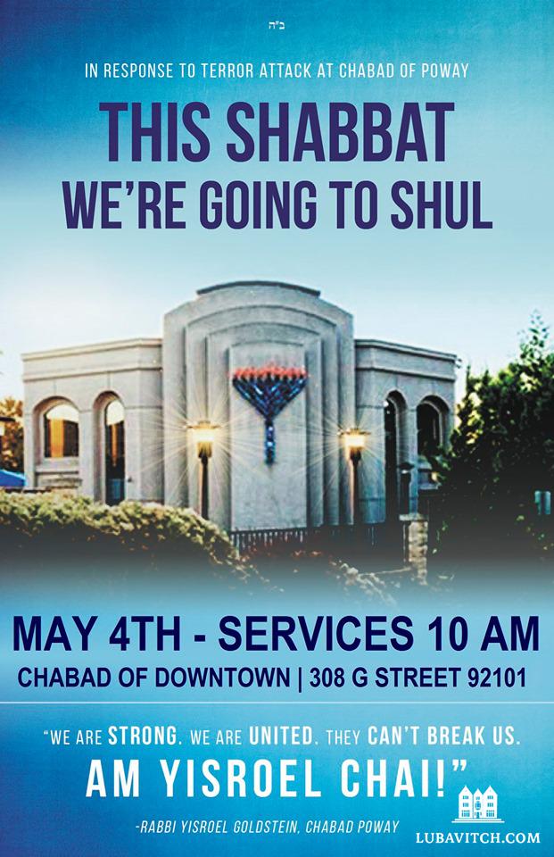 A flyer announcing synagogue attendance this Shabbat at Chabad of San Diego-Downtown
